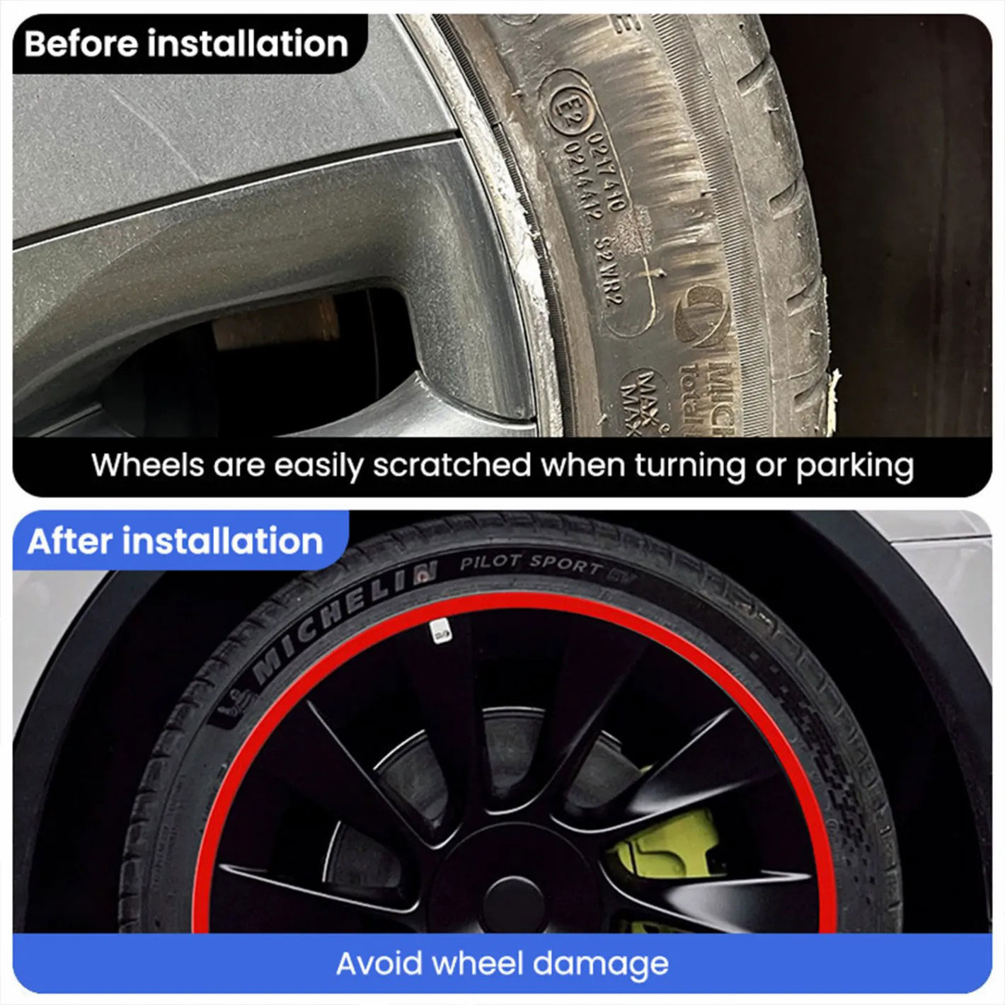 - Aesthetic Enhancement: Keep your Tesla wheels looking pristine and stylish by covering existing scratches and preventing new ones with our sleek rim protectors.