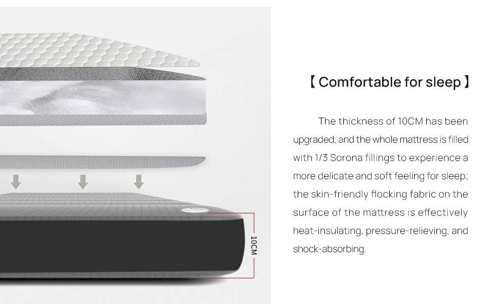 - Comfortable for Sleep: The thickness of 10CM has been upgraded, and the whole mattress is filled with 1/3 Sorona fillings to experience a more delicate and soft feeling for sleep; the skin-friendly flocking fabric on the surface of the mattress is effectively heat-insulating, pressure-relieving, and shock-absorbing. Ice silk fitted sheet is easy to clean, soft, breathable, and hygroscopic