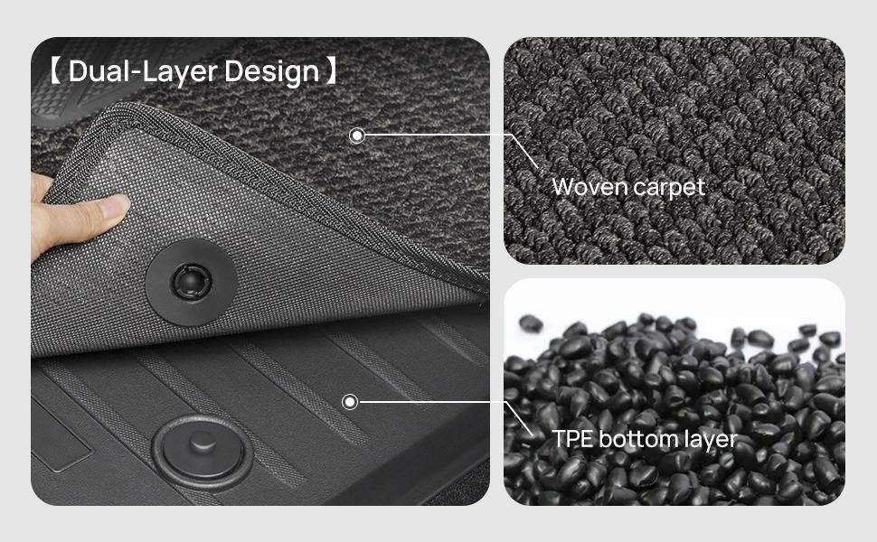 Dual-Layer Design: Eco-friendly waterproof TPE bottom layer. Along with a dust-resistant woven carpet floor mat on the top.
