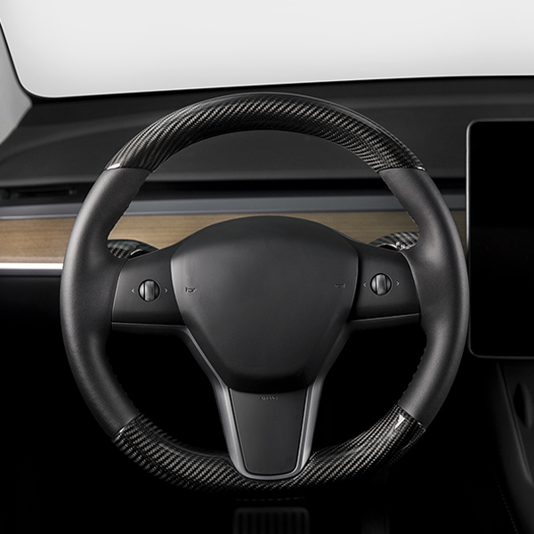 Custom molded Tesla Model 3/Y steering wheel cover. Our 100% genuine carbon fiber cover adds a performance touch to the OEM steering wheel.