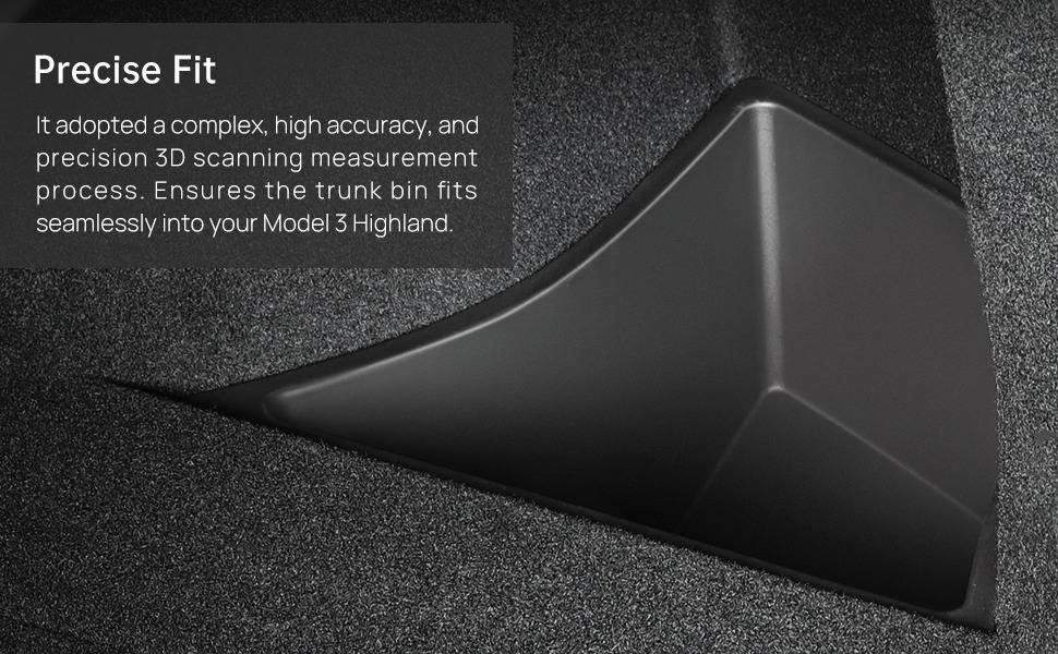 【Precise Fit】 It adopted a complex, high accuracy, and precision 3D scanning measurement process. Ensures the trunk bin fits seamlessly into your Model 3 Highland